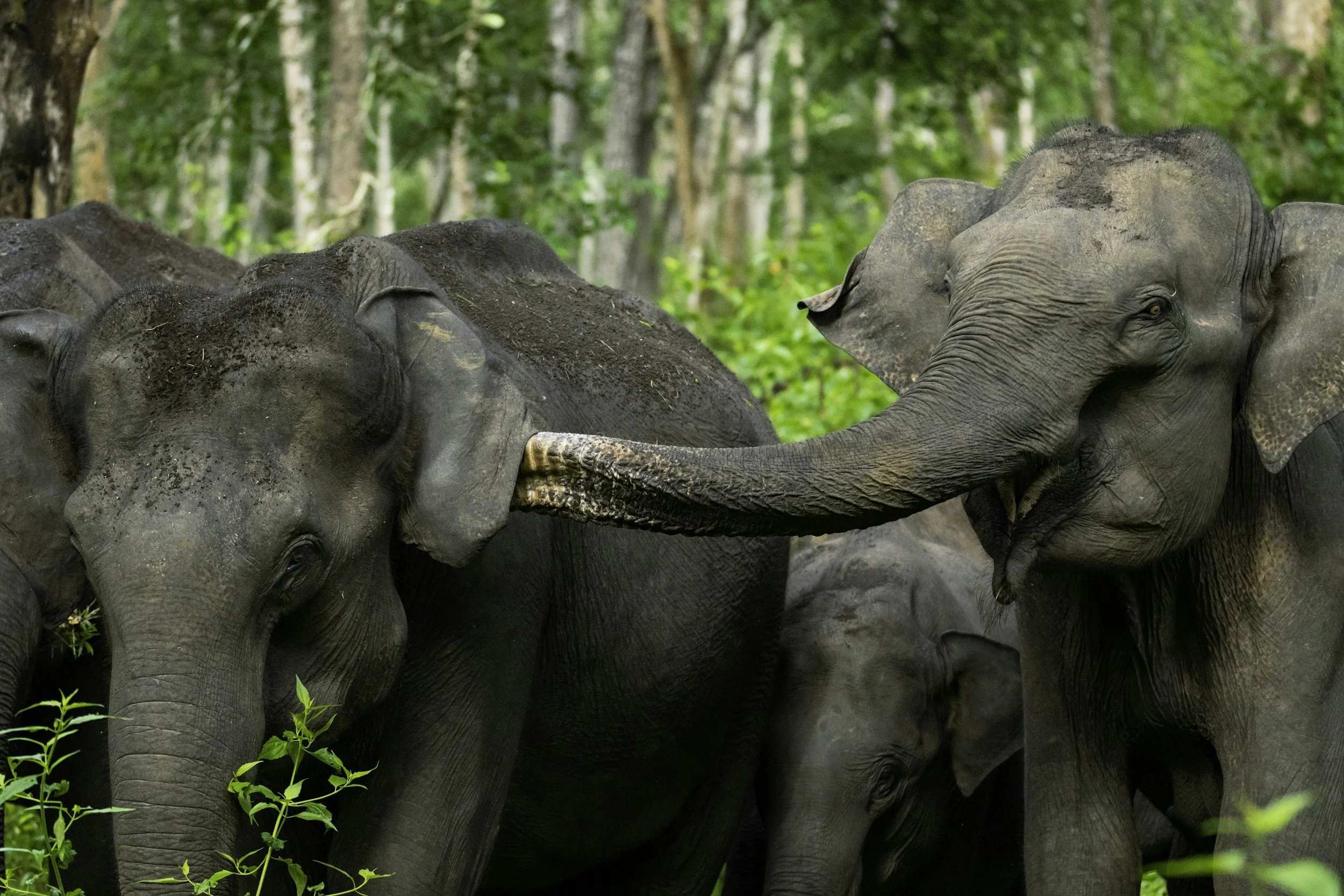 Several elephants in a green forest, one elephant using its trunk to touch another elephant's ear.